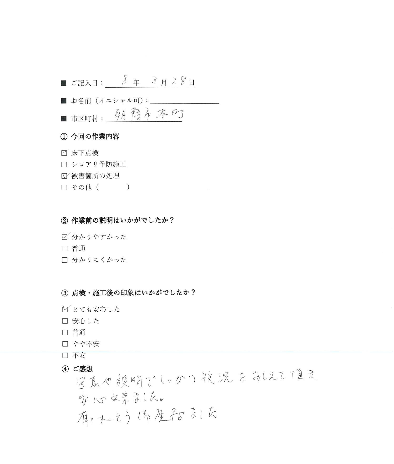 お客様の声|朝霞市 X様 シロアリ駆除 朝霞市 お客様のコメント 写真や説明でしっかり状況をおしえて頂き、安心しました。 X様 アンケート画像 ← Prev 一覧へ戻る その他のお客様の声 NEW シロアリ駆除 写真や説明でしっかり状況をおしえて頂き、安心しました。 朝霞市 X様
