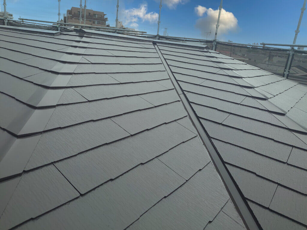 今回は同系色での屋根塗装でした。同系色での塗装でも、新築の用のがらりと雰囲気が変わり施主様に喜んでいただけました。